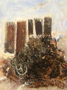 2023Mixed media met jutters materiaal als zeewier, touw en touw maar ook karton en jute. op 50×70 cm doek, afgewerkt met een ambachtelijke Tonio baklijst. Uit de serie van vijf Zeeuwse kust werken.