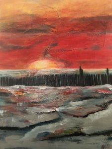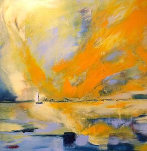2023Voor de zon die op het water speelt, voor het water dat de zon bespeelt. Acryl met coldwax op doek met lijst. Geinspireerd door Emile Nolde en Herman van Veen
