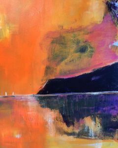 2023De zon kust het water en het water spiegelt de zon. Geïnspireerd door Emile Nolde en Herman van Veen. Acryl met coldwax op 50x70 cm doek met Tonio lijst.