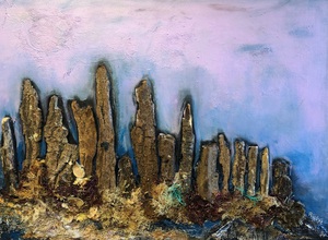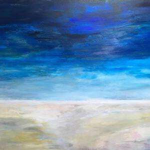 2023Mixed media op 50×70 cm doek. Gebruik gemaakt van zand, schelpen en acrylverf. Afwerkt met vernislaag en in een handgemaakte baklijst.