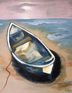2023Vissers wachten op vloed Warme herinnering aan de vissersbootjes bij eb aan de Spaanse zuid kust. Acryl op 40×50 cm linnen doek. Prijs 175 euro per stuk Uit de serie vissersbootjes.